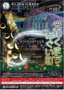 2023年12月14日(木) 光輝くまち あぐい町 イルミネーション★ 阿久比町制70周年記念 イルミネーションinあぐい 12月10日~26日17:00~21:00 阿久比町役場芝生広場をメインとして、阿久比町内、阿久比町商工会会員の事業所及び店舗等へイルミネーションを施しています。お立ち寄りの際にはぜひご覧ください。 お問い合わせ先:阿久比町商工会 電話:0569-48-7085 阿久比町役場 芝生広場にて高さ4M竹のほたるツリーと長さ10M光のトンネル 飾りの中にアグピーが隠れているので見つけてください。