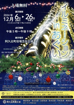 2024年12月05日(木) イルミネーションinあぐい 2024 開催します イルミネーション in あぐい2024が開催されます。 【期間】12月26日(木)まで 【時間】毎日午後5時〜午後9時まで 【場所】阿久比町役場・町内商工会会員事業所及び店舗 高さ5Mの竹はたるツリー・長さ15Mの光のトンネル・アグピーのお尻を模した光ドームが設置されております。 前年よりパワーアップしております。暖かくしてお越しください。