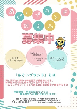 2025年07月17日(木) あぐいブランド認定品募集中 あぐいブランドとは? 阿久比町に関わる特産品及び農産物のうち、町の魅力及び知名度の向上に資すると認められるものを、「あぐいブランド認定品」として阿久比町観光協会が認定するものです。 *認定シールの交付 *各種メディアへの情報提供 *パンフレット等への掲載 *観光イベント等への出展優遇 申請資格・申請方法については観光協会へお問い合わせください。 阿久比町観光協会 TEL:0569-48-1111 メール:aguikanko@gmail.com